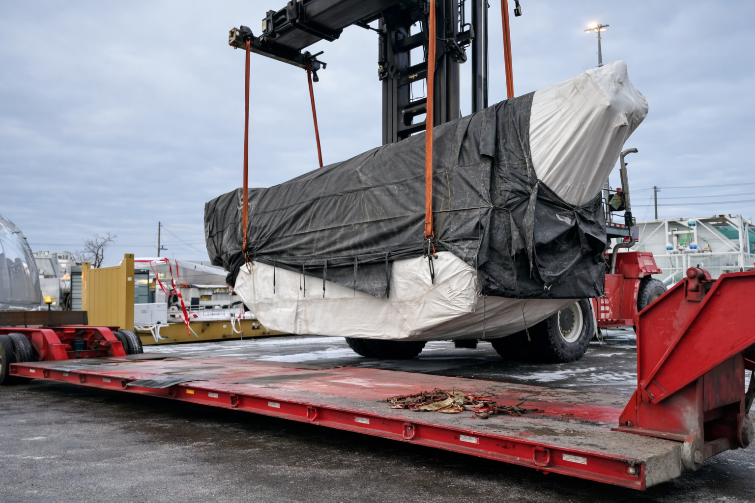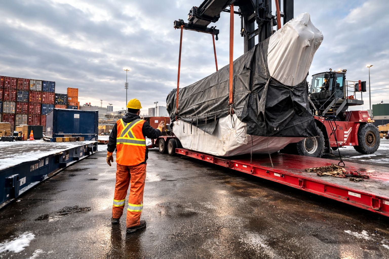 Una vez descargada la maquinaria, comienza una de las etapas más complejas: el transporte terrestre de carga sobredimensionada.